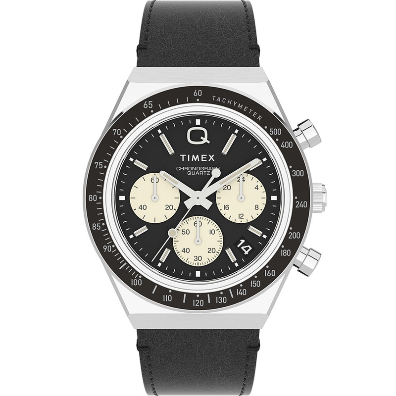 Stainless Steel Case Black Leather Strap Chrono 50 Metres Water Resistant