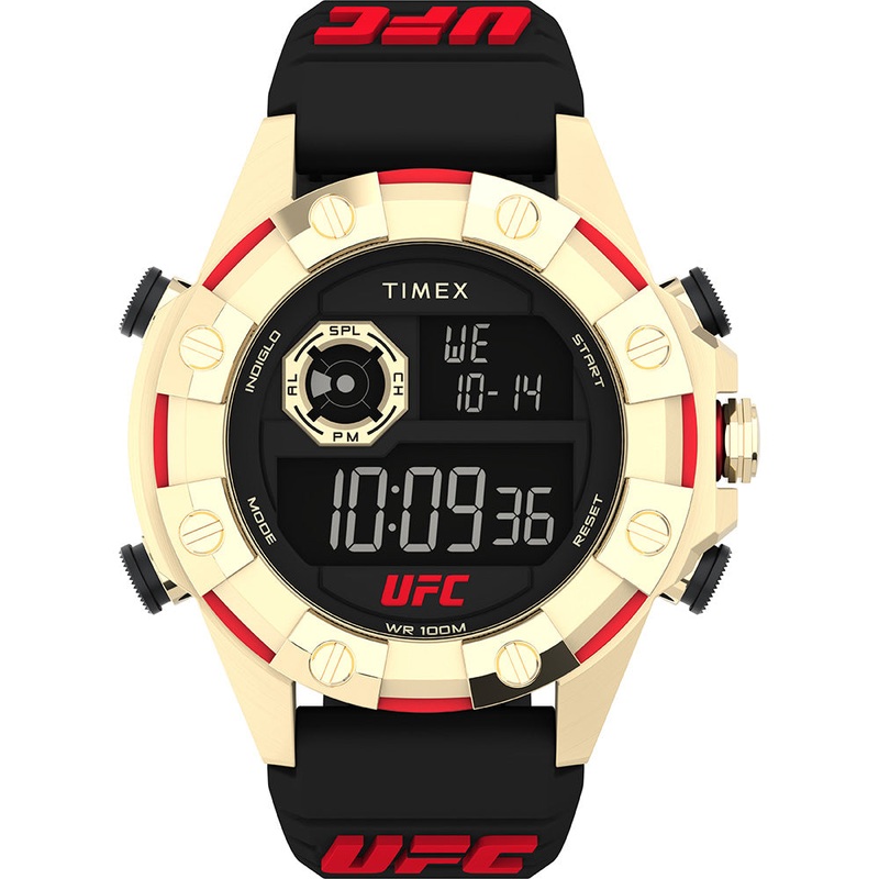 Enter the octagon with the UFC Kick Digital. This powerhouse timepiece packs a punch with its robust 49mm gold-tone stainless steel case and bezel, complemented by a durable black resin strap. Sporting an octagonal sub-dial with alarm, split, chronograph, and AM/PM feature indicators, it’s tailor-made for tracking time during intense training sessions or downtime. With a countdown timer for optimizing workouts and ensuring peak performance, this watch is a must-have for any athlete. Complete with an INDIGLO backlight and 100m water resistance, it’s ready for action anytime, anywhere. Step up your game with the UFC Kick Digitala champion’s choice in both style and functionality.- Digital- 49mm Case Size – Stainless Steel Case – Polyurethane Band – 100 Meters Water Resistant