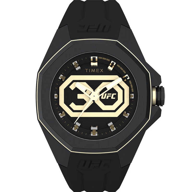 The UFC Pro 30th features a 45mm case, a black dial with a big gold-tone 30the anniversary logo. The stainless-steel bezel, designed to represent the octagon ring this timepiece is a definite homage to the sport. Whether youre having a sparring session in the octagon or enjoying the outdoors this watch is up for any challenge. – Quartz Movement – 45mm Case Size – Resin Strap – 100 Meters Water Resistant