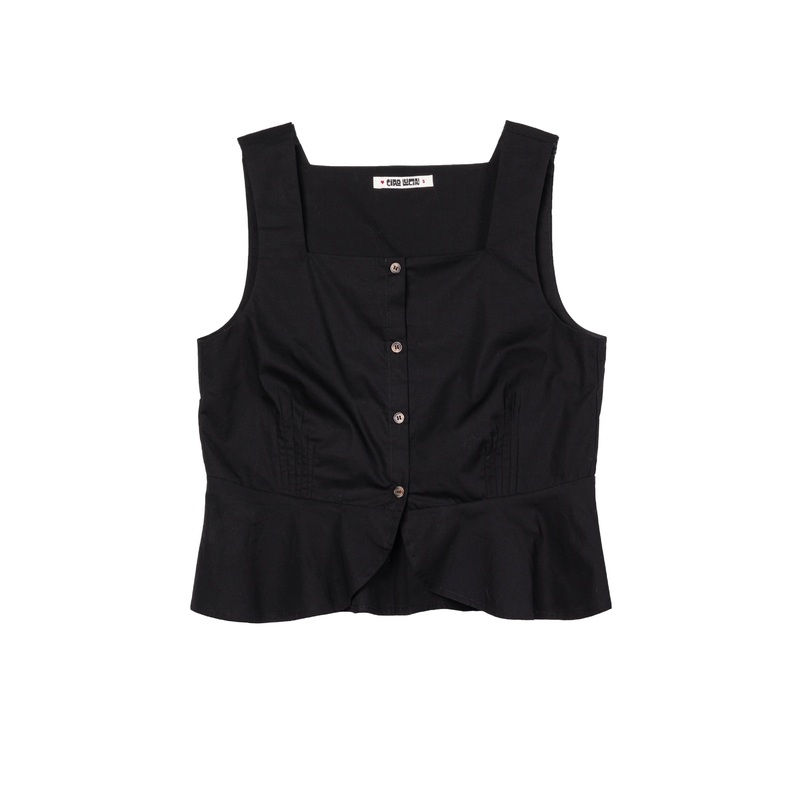 The Timir Top in black is a structured button-down cotton poplin peplum top with a square neckline and pleating details.
