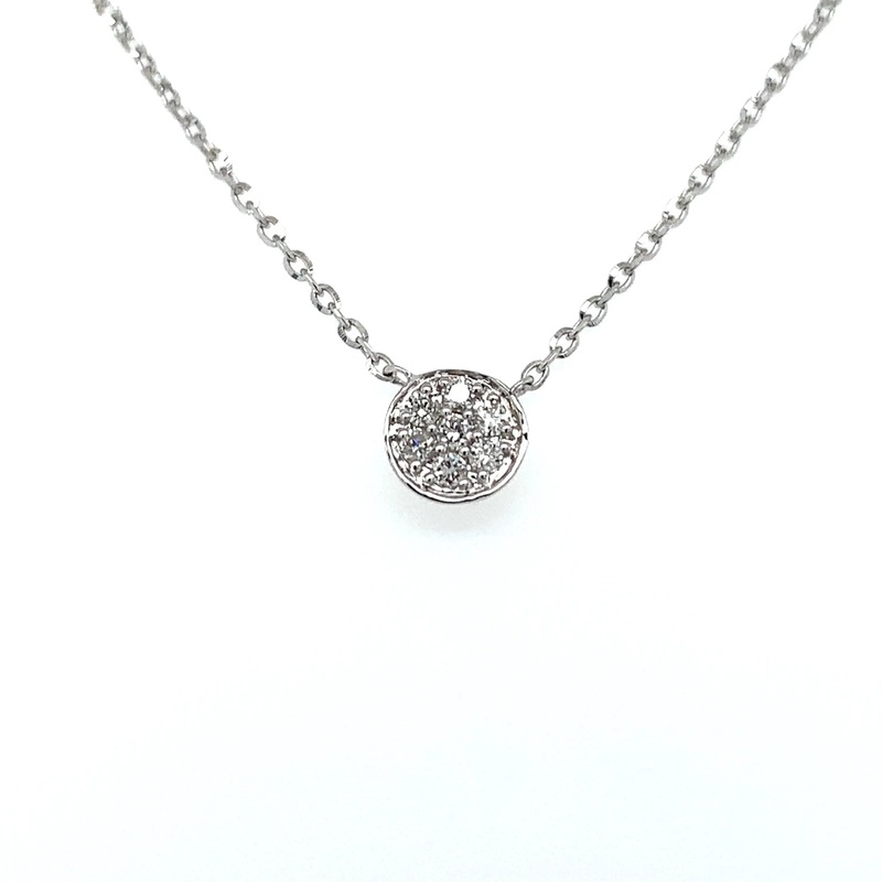 14 karat white gold TINY PAVE DISC diamond pendant set with 7 R cut Lab Grown Diamonds having a total weight of 0.07 carats Clarity: SI1 Color: H Pendant is suspended from a Diamond cut 14 karat white gold 16 inch 18 ADJUSTABLE CABLE chain