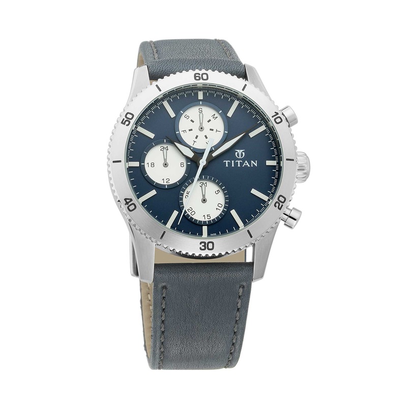 Gender MenStrap Material LeatherStrap Color BlueDial Color BlueCase Width 42.50 mmCase Length 50.00 mmCase Thickness 12.10 mmCase Material Stainless SteelCase Shape RoundMovement QuartzWater Resistance 5 ATMWarranty Period 24 Months