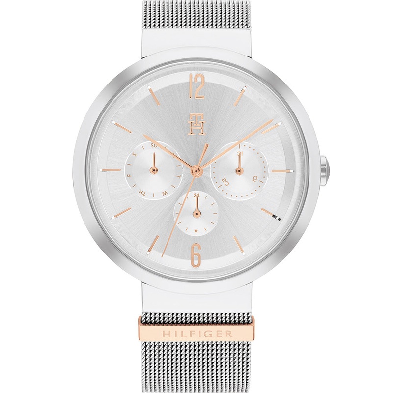 Presenting the Tommy Hilfiger 1782537 a womens watch with a two-tone silver and rose gold finish that exudes class. The strap combines the look of fabric mesh with the premium materials of stainless steel to create a luxurious strap that keeps its original identity. The dial is silver with a brushed metal finish and features three subdials that function as a day, date, and secondary 24-hour time display. The watch hands and hour markers are rose gold to complement the piece on the strap.