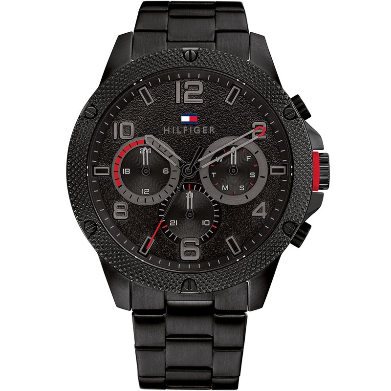 Introducing the Tommy Hilfiger Blaze 1792030 Multi-Function watch, a bold statement of contemporary style and practicality. With its black PVD case and matching bracelet, it exudes a sleek and modern appearance suitable for any occasion. The black dial, accentuated with black and red accents, offers a striking contrast and enhances its overall aesthetic appeal. Powered by a quartz multifunction movement, it ensures precise timekeeping and reliability. Featuring a substantial 46mm case size, 11mm case thickness, and 22mm band width, it provides a robust yet comfortable fit on the wrist. Equipped with mineral crystal, it offers durability and protection against scratches. This timepiece is water resistant up to 50 meters, making it suitable for daily wear and activities involving water exposure. Ideal for individuals who appreciate a blend of bold design, functionality, and durability in their watch collection.- Quartz Multifunction Movement- 46mm Case Size – 11mm Case Thickness – 22mm Band Width- Black PVD Case and Bracelet- Mineral Crystal – 50 Meters Water Resistant