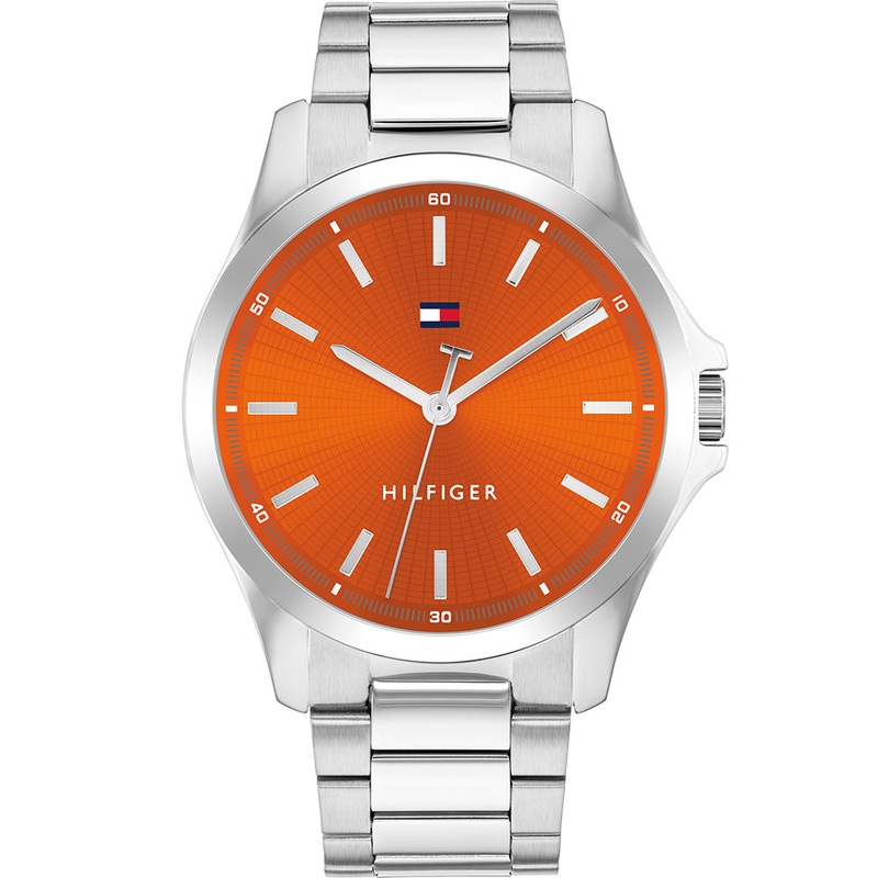 The Tommy Hilfiger Bruce 1710678 is a striking timepiece that brings a pop of colour to your wrist with its bold orange dial. Housed in a 42mm stainless steel case, this watch offers both style and durability, making it perfect for everyday wear. The silver-tone stainless steel bracelet completes the look, offering a sleek and modern design that pairs well with any outfit.- Quartz Movement – 42mm Case Size – 10mm Case Thickness – Stainless Steel Case and Bracelet – 30 Meters Water Resistant