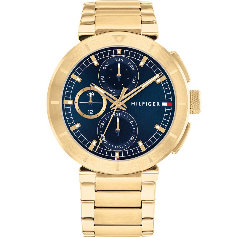 Introducing the Tommy Hilfiger Lorenzo 1792118 Multi-Function watch, a blend of luxurious design and practical features. Its IP thin gold case and bracelet exude a rich, sophisticated appeal, perfect for those who appreciate standout style. The navy-blue dial, adorned with gold accents, adds depth and contrast, enhancing its overall elegance. With a substantial 44mm case size, it offers a bold yet comfortable fit on the wrist. This timepiece is not only stylish but also functional, boasting multi-function capabilities to suit everyday needs. Additionally, with a water resistance of up to 50 meters, it ensures durability and reliability in various environments. Ideal for individuals seeking a timepiece that seamlessly combines fashion-forward design with versatility and performance.- Multi-Function – 44mm Case Size – IP Think Gold Case and Bracelet – 50 Meters Water Resistant