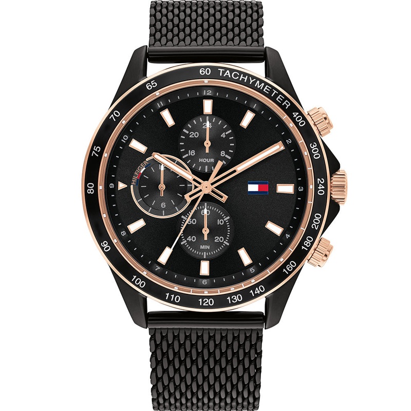 Introducing the Tommy Hilfiger Miles 1792020 Multi-Function watch, a sleek and modern timepiece designed for both style and functionality. Featuring an iconic plated black steel case and mesh band, it offers a contemporary and sophisticated look suitable for any occasion. The black dial, complemented by rose gold accents, adds a touch of elegance and enhances its overall aesthetic appeal. Powered by a quartz multifunction movement, it ensures precise timekeeping and reliability. With a comfortable 44mm case size, 10.7mm case thickness, and 21mm band width, it provides a balanced presence on the wrist. Equipped with mineral crystal, it offers durability and protects against scratches. This timepiece is water resistant up to 50 meters, making it suitable for daily wear and activities involving water exposure. Ideal for individuals who appreciate a blend of modern design, practical features, and understated luxury in their watch collection.- Quartz Multifunction Movement- 44mm Case Size – 10.7mm Case Thickness – 21mm Band Width- Ionic Plated Black Steel Case and Bracelet- Mineral Crystal – 50 Meters Water Resistant