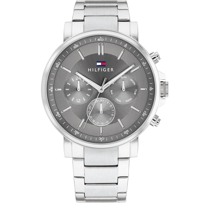 Introducing the Tommy Hilfiger Tyson 1710604 Multi-Function watch, a stylish embodiment of modern sophistication and functionality. With its stainless-steel case and bracelet in silver tones, it offers a sleek and versatile design suitable for any occasion. The grey dial, complemented by silver accents, adds a touch of refinement and enhances its overall aesthetic appeal. Featuring a substantial 44mm case size, it provides a confident presence on the wrist while ensuring comfort. This timepiece not only boasts multi-function capabilities but also offers water resistance up to 50 meters, making it suitable for daily wear and various activities. Ideal for those who appreciate a blend of contemporary style and practical features in their accessories.- Multi-Function- 44mm Case Size – Stainless Steel Case and Bracelet – 50 Meters Water Resistant