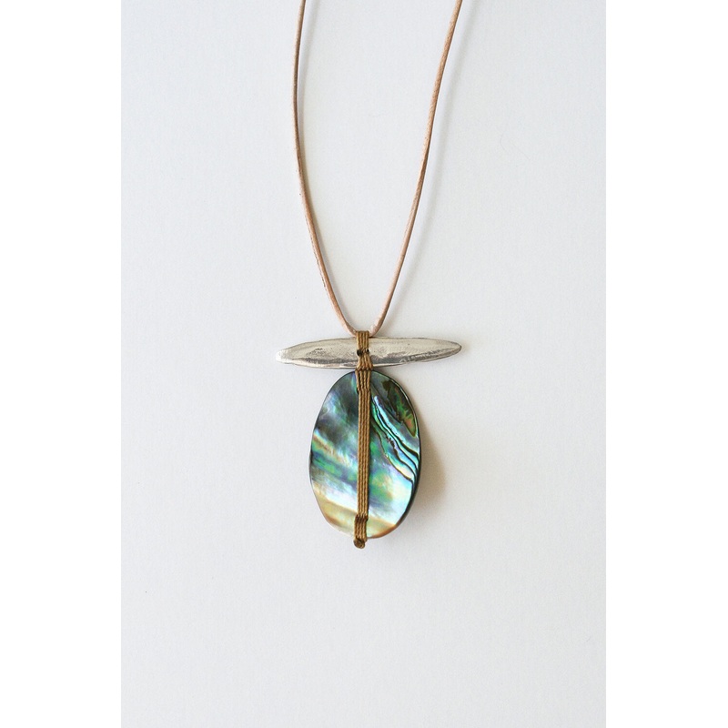 Despite being untreated, the shell has a beautiful natural shine and luster. The pendant measures about 1.5 inches long, and the silver piece is about 1.25 inches wide. It is woven onto a leather cord 28 inches long with handmade cream colored tassels at t