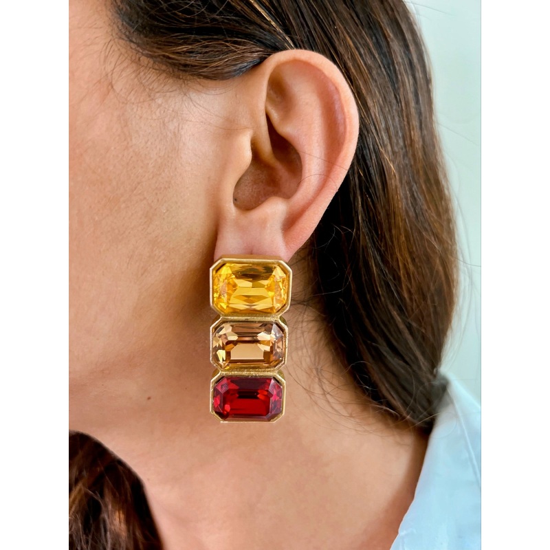 The Tri Candy Earrings are studded with semi precious swarovski crystals stones. These earrings can be carried effortlessly through your day to night looks, adding a touch of elegance to your everyday ensemble. They are a perfect for any occasion – from dinners to weddings to date night – these are the perfect fit for you.