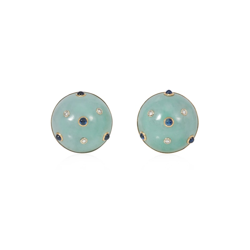 These signed vintage Trianon earclips feature a distinctive bomb design crafted from jade, accented with cabochon sapphires and diamonds. Made in the 1980s, these earrings are set in 14kt yellow gold and have an approximate total weight of 0.09 carats for the diamonds. With a diameter of 7/8″ and weighing 20.55 grams, they offer a unique blend of materials that reflect their era’s style while maintaining timeless appeal.