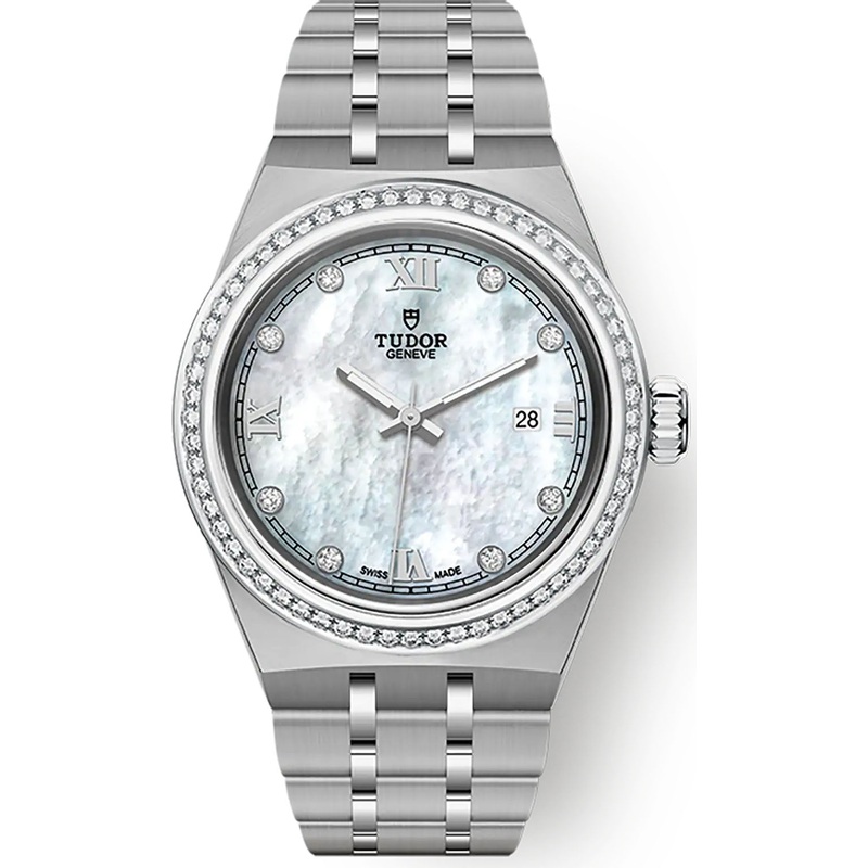 Epitomising affordable luxury and a chic, sporty personality, the TUDOR Royal watch is by far one of the most popular lines created by the Genevan based manufacturer. The TUDOR Royal watch reference M28320-0001 showcases a captivating mother of pearl dial, framed by a stainless steel case that measures a 26mm diameter. Ergonomically developed for comfort on the wrist, this ladys Tudor watch combines superior materials with expert craftsmanship. A row of meticulously set round brilliant cut diamonds is positioned around the bezel of this elegant ladys dress watch, enticing light to ignite the shimmering iridescent shades of the mother of pearl display. The TUDOR Royal watch also features luminous central hour and minute hands and a date feature at 3 oclock.