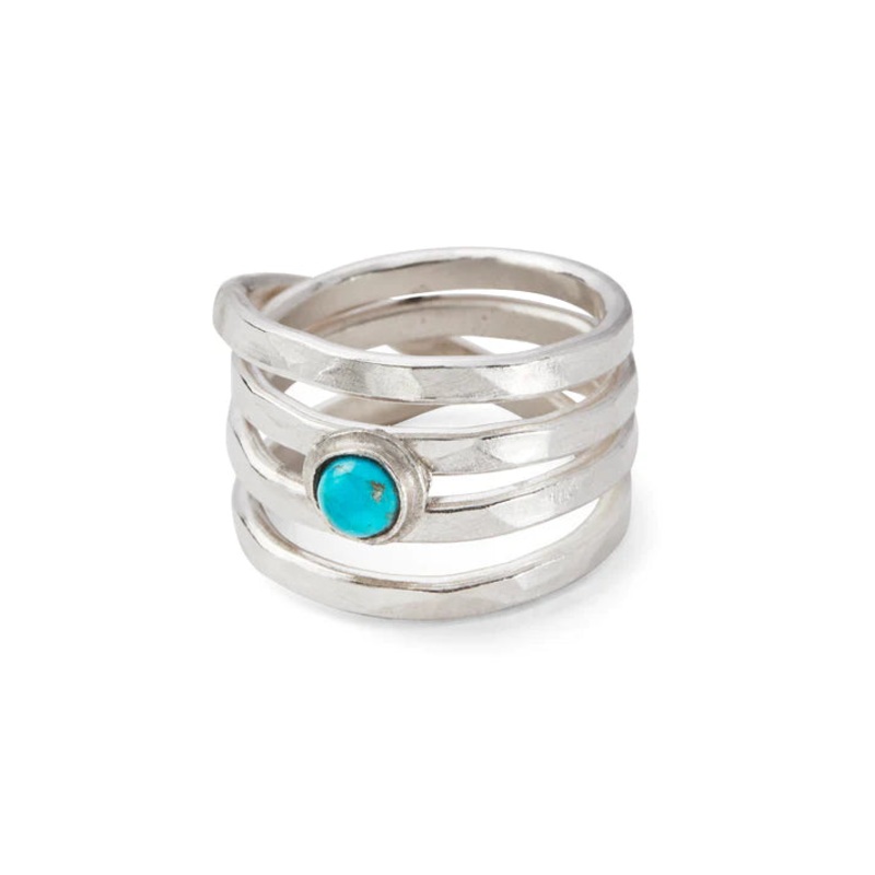The 4mm turquoise set in sterling silver adorns a hammered sterling silver continuously wrapped band.