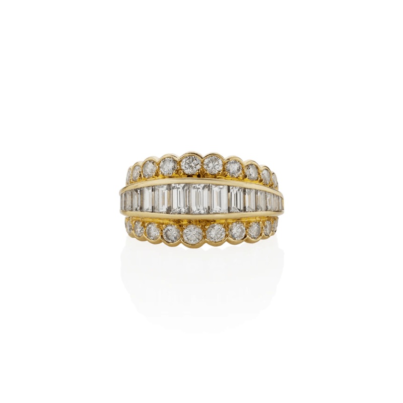 This Van Cleef & Arpels diamond ring, crafted in the 1970s, is made of 18kt gold and approximately 3.40 carats of diamonds. The design features a tapering channel-set line of baguette diamonds edged by round brilliant-cut diamonds, creating a delightful co