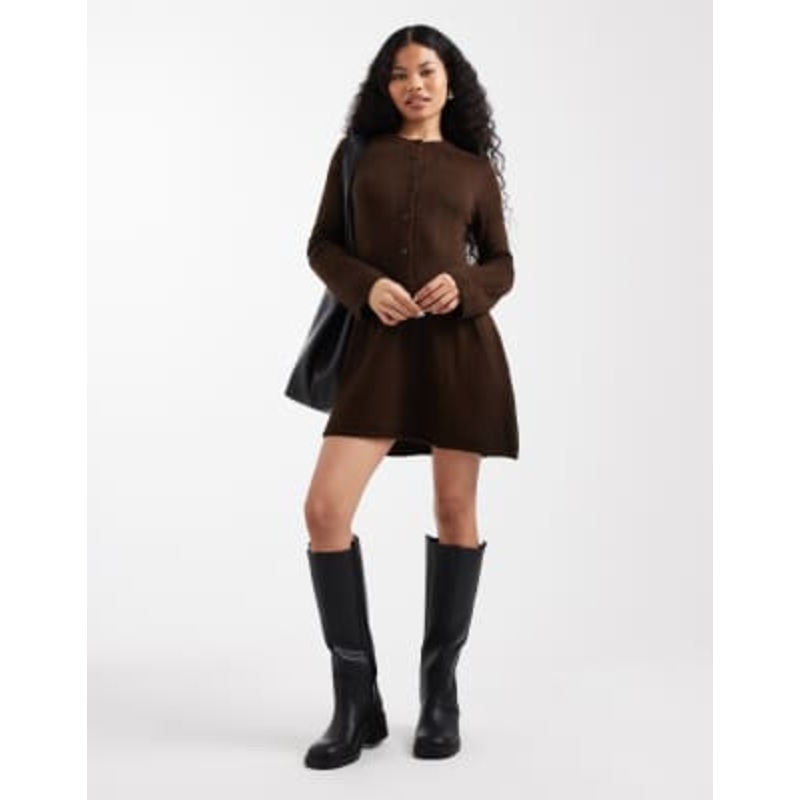 Vero Moda Petite soft knitted button front mini dress in chocolate melange