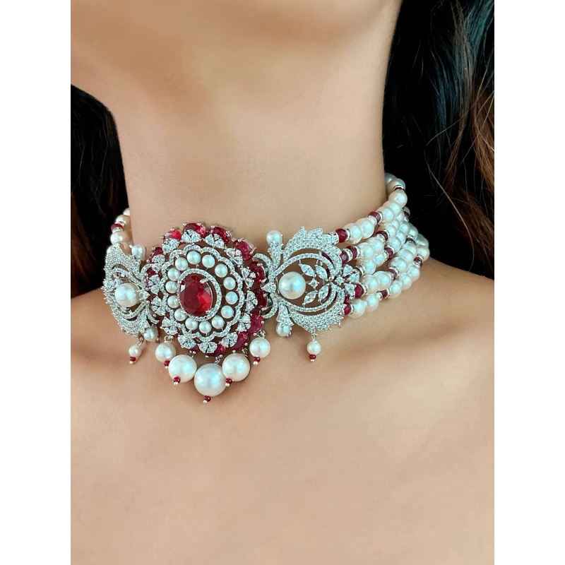 Indo western wear at its finest, the pearl adorned Victoria Rubyset which includes Earrings & Necklace from our Indian Jewellery segment, combines beauty and elegance giving its wearer the best of both worlds. Make your mark, sport this choker and leave everyone stunned!