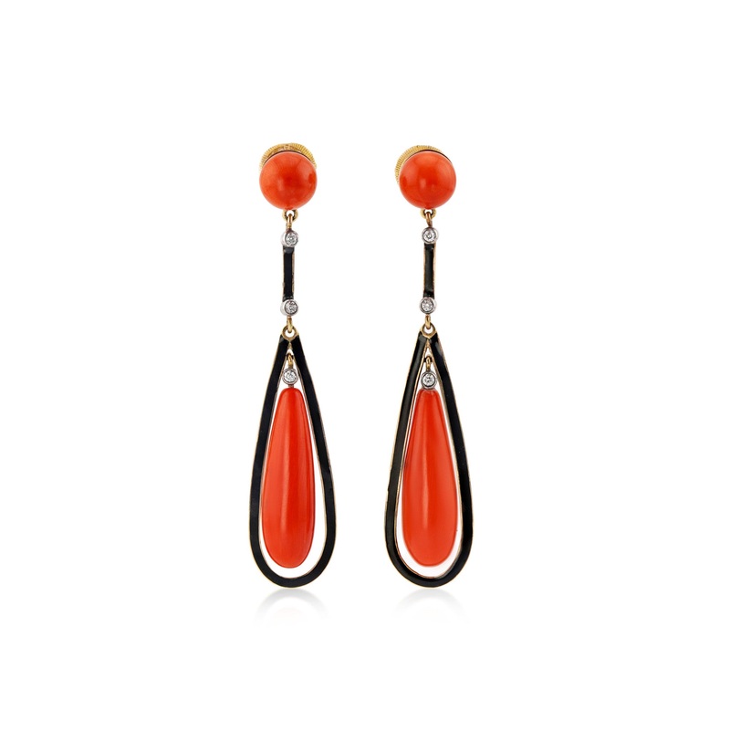 These antique coral, enamel and diamond pendant earrings are crafted in 18kt yellow gold, reflecting the Victorian design period. Dating back to around 1890, they feature a unique screw-back closure instead of traditional posts. The earrings measure approximately 2 inches long and showcase coral stones complemented by diamonds. They are well-preserved for their age, offering a glimpse into vintage elegance.