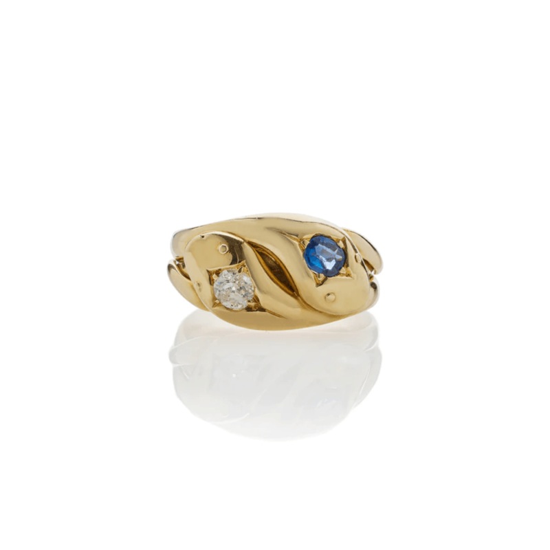 This sapphire and diamond double snake ring is a late Victorian piece, crafted in England in 1892. The ring features two snake heads, each adorned with either an old European-cut diamond of approximately 0.25 carats, or a cushion-cut sapphire of approximately 0.40 carats. The snakes’ intertwined bodies and tapering tails complete the design of this substantial 18kt gold ring. It carries a hallmark for Chester with the letter date 1892. This size 8 ring can be resized upon request.