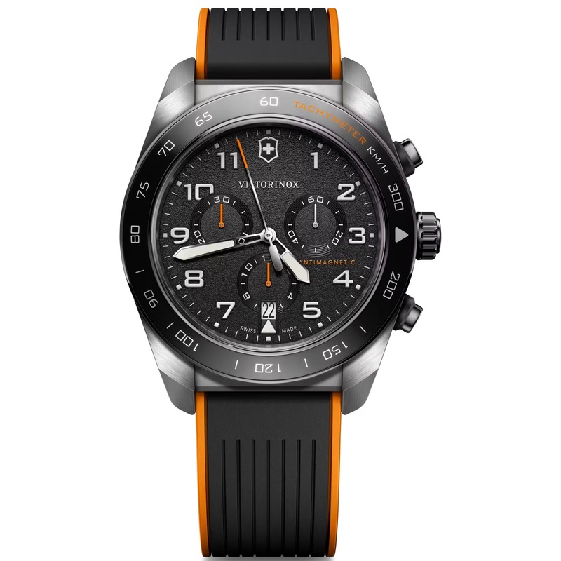 Victorinox Swiss Army Chronograph Watch 242050. Timepiece with a tachymeter on the bezel. Exceptionally engineered to deliver in any challenging condition; the Swiss Army Chronograph is where resilience and uncompromising accuracy converge. Equipped with Swiss made Ronda 5030.D movement, plus three sub-dials for split timing; its a master of precision. The integrated tachymeter on the polished, stainless steel bezel expertly tracks distance and time. The adjustable, mesh bracelet allows for customisable sizing. Use it to track your progress on gym circuits or record global mileage on flights.