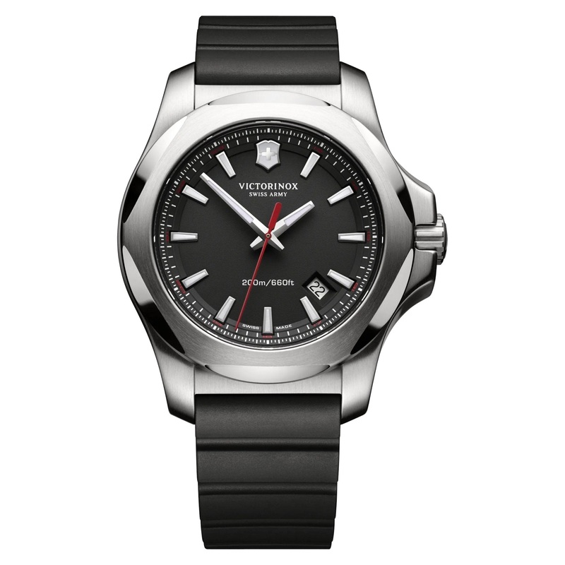 Like all of our watches, this Victorinox Swiss Army I.N.O.X. Stainless Steel Black Dial Black Rubber Strap Date Divers Quartz Mens Watch is brand new and comes in its original packaging.