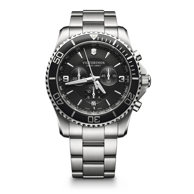 Victorinox Swiss Army Maverick Chronograph Stainless Steel Black Dial Date Quartz Mens Watch Model# 241695 / V241695 The Maverick collection watches encapsulate everything a professional deep-sea diver or even a recreational diver would ever want, and need