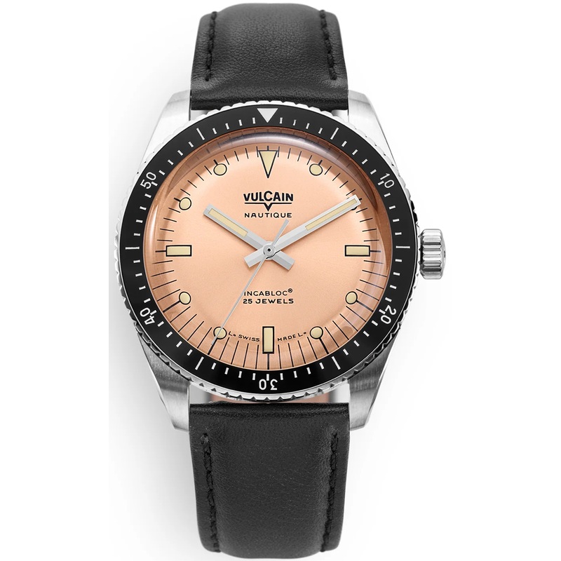 Vulcain Watch Skindiver Nautique Salmon Black Leather Limited Edition 660170B87.BAC201. Think Vulcain and the first thing that comes to mind is Cricket. That would be selling the brand short; Vulcain is a treasure trove of watchmaking sleeping beauties that resonate with a nostalgic vibe. The SkindiverNautique is all set to make a splash in the vintage-like market. Inspired by a Vulcain model launched in 1960, it is powered by ETAs 2824 three-hand Swiss automatic caliber with a 38-hour power reserve, the workhorse among the famed movement makers range of mechanical calibers.