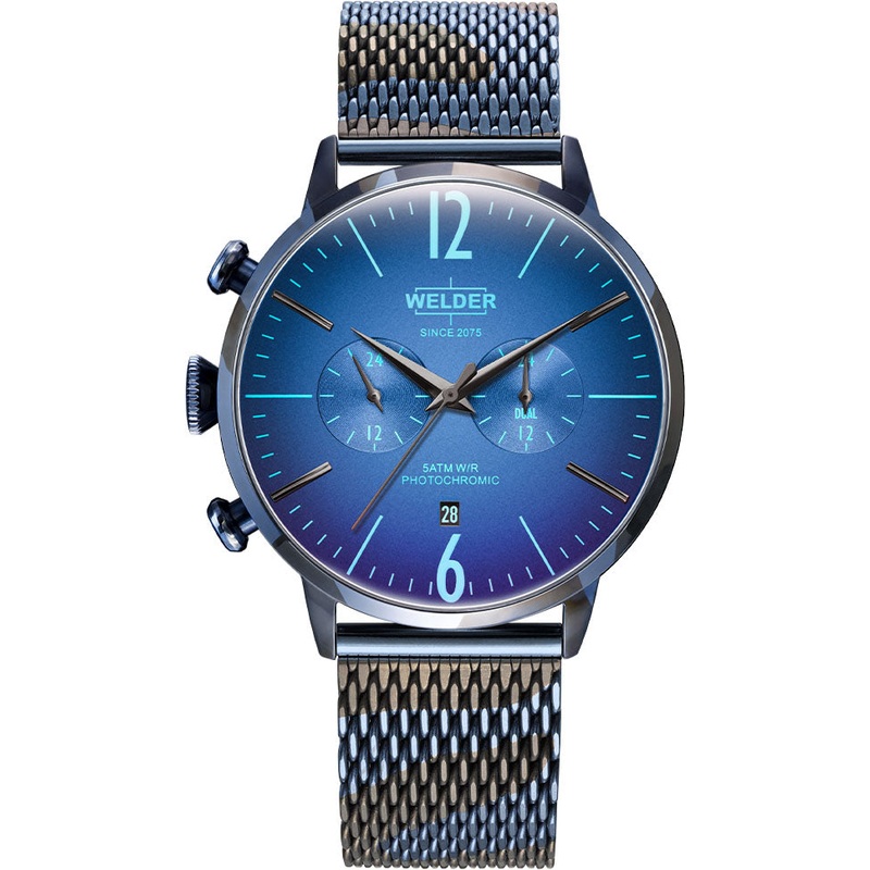 Welder Watch Moody Blue Camouflage Mens WWRC1015. Infused with Italian design and flair, each Welder watch boasts its very own personality with a unique style, colour and shape. One thing that all Welder watches share is the famous crown featured on left hand side of the case rather than the right like most watches.