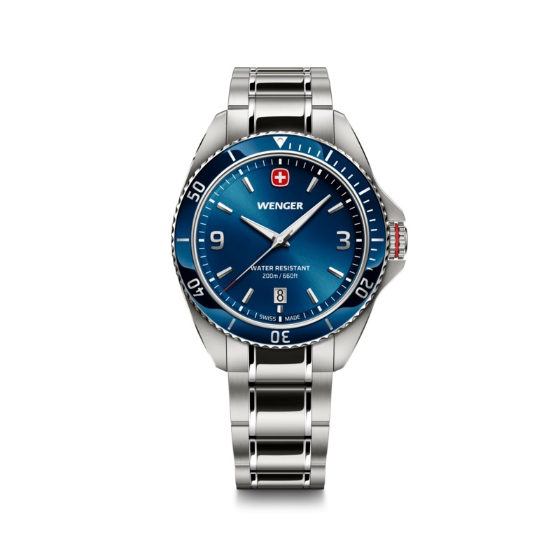 Refined and resilient, the Wenger Executive 40mm men’s watch combines Swiss-made quartz precision with distinguished design. Its sunray brushed blue dial, framed by a brushed stainless steel bezel, delivers a bold yet elegant presence ideal for both professional settings and daily wear. Featuring a stainless steel bracelet with a push-button safety clasp, this timepiece offers effortless style and comfort with tool-free adjustability. The screw-down crown and 200-meter water resistance ensure durability, while luminescent hands and a discreet date window enhance functionality in all conditions. Sophisticated yet practical, it stands out in the men’s watch category for its balance of craftsmanship, performance, and timeless appeal.