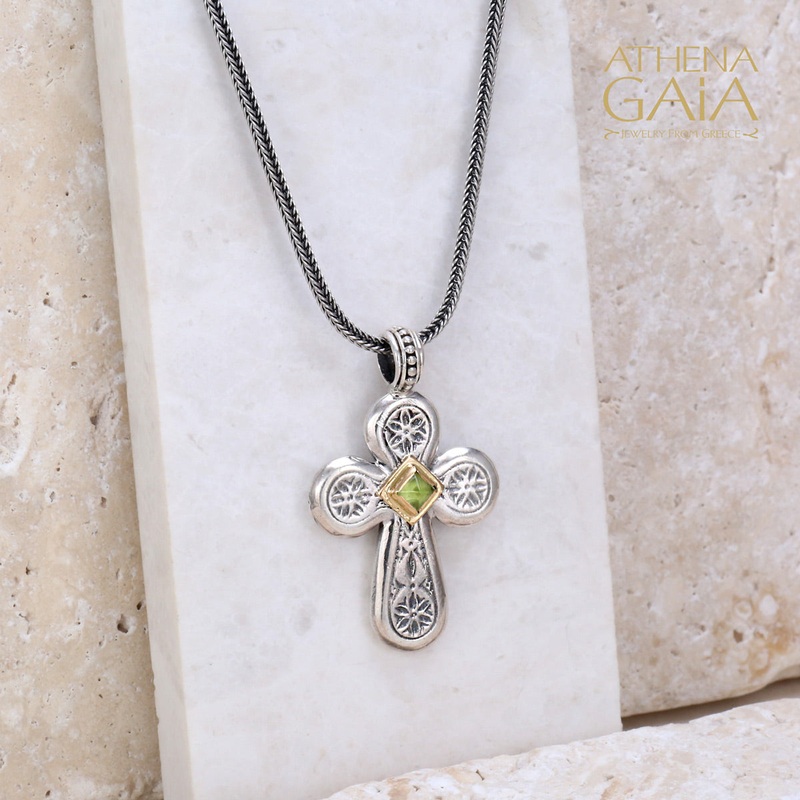 The Western Etched Pomme Cross is handcrafted with 18k gold and sterling silver. Adorned with a center stone, this cross is the epitome of elegance and luxury. Perfect for baptisms, special events, or as a daily statement piece.