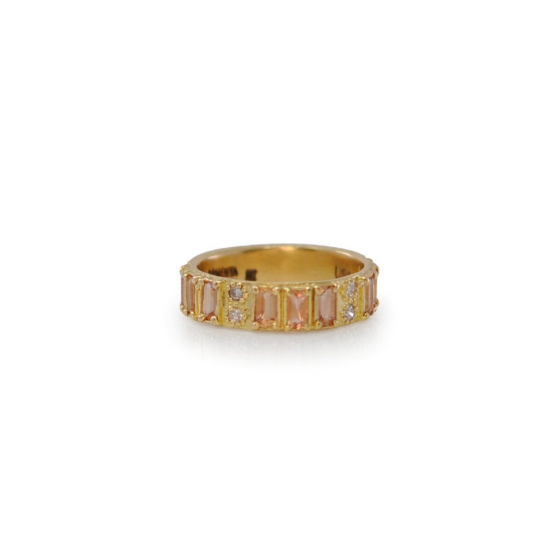 18k Yellow Gold 5mm wide band ring with Peach Imperial Topaz baguettes and white diamonds.