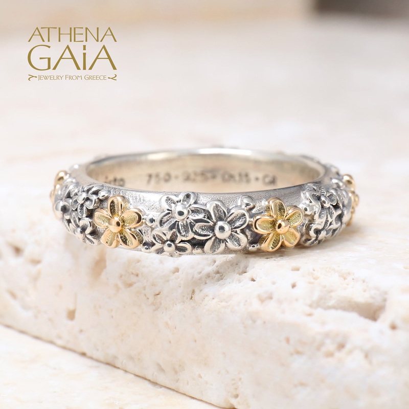 This listing is for a single Wild Flowers Band Ring, as shown. It has detail all around, with solid 18k Gold flower decoration, and is beautiful worn on its own or stacked.