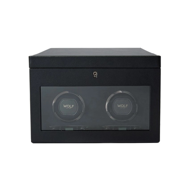 Wolf British Racing Double Watch Winder with Storage. Black. Rotation options: 10 second start delay. Can be set between 300 and 1,200 TPD (turns per day). Double the amount of TPD by selecting bi-directional setting. Storage: 2 winding modules, 2pc watch storage with suspended cushions (cuff will accommodate up to 52mmcase) 1 open compartment, travel case (1pc watch storage, 1 lidded compartment).