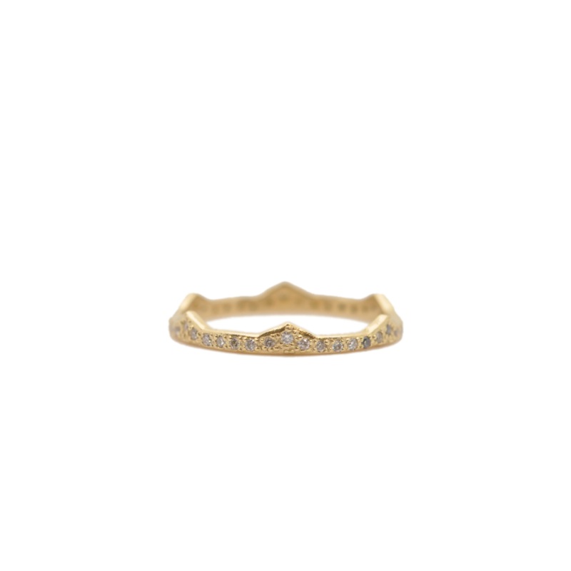 18k Yellow Gold pointed stack ring with 0.20TCW round white diamonds. Ring band measures 2.76mm wide at the widest point and 1.5mm at thinnest point.