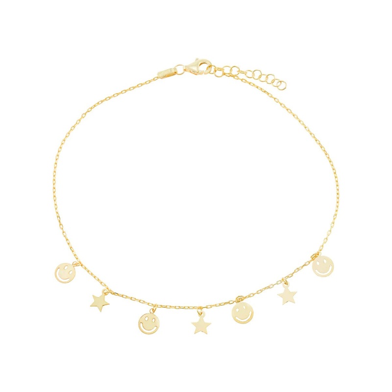 Add some fun to your ankle with the Yellow Gold Plated Sterling Silver 10″ Smiley Face and Star Ankle Bracelet! This playful and quirky accessory will surely bring a smile to your face (and others’) with its charming smiley face and star design. Made with quality sterling silver, it’s the perfect addition to any outfit.