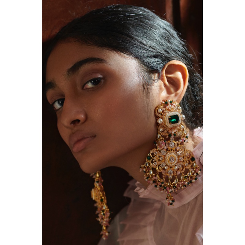 The Zarah earrings, embedded with handsome semi-precious stones and alluring colours of white, green and pink is a definite head turner at your next festive occasion.