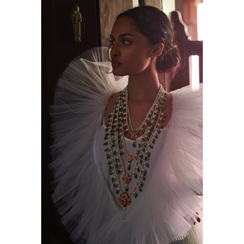 The Zarrin necklace is a part of the Jannah CollectionGoing for a grand and regal look? The layered Zarrin necklace is the perfect fit for you. With high quality pearls, precious carved beads and semi precious stones, the Zarrin necklace is all you need to